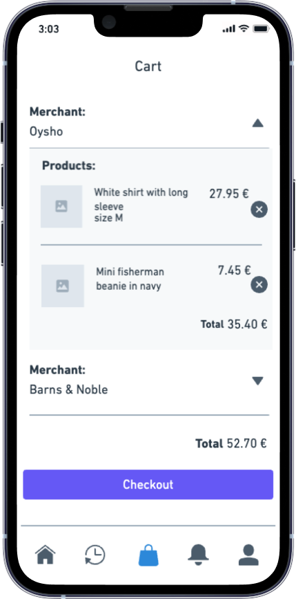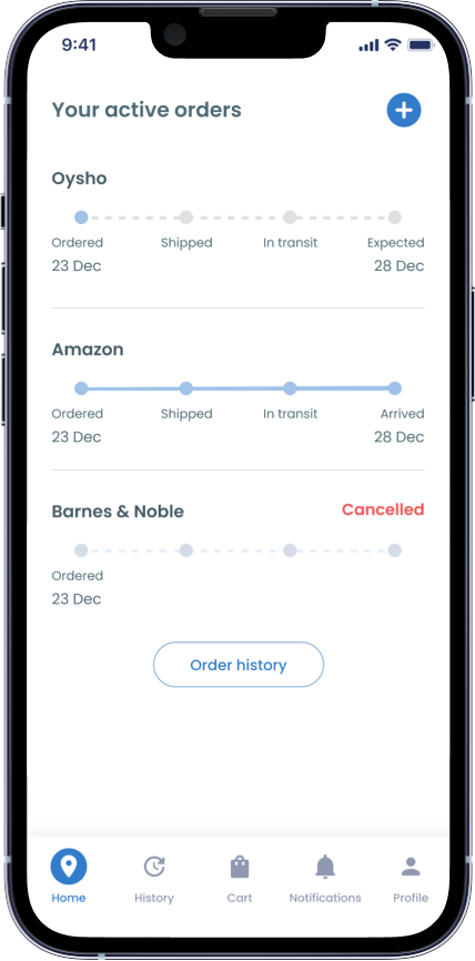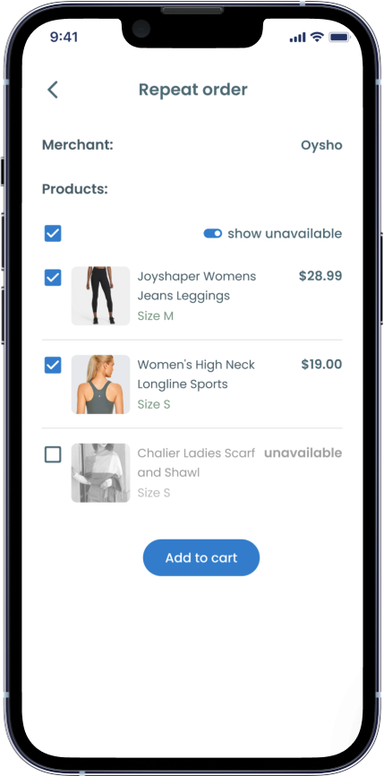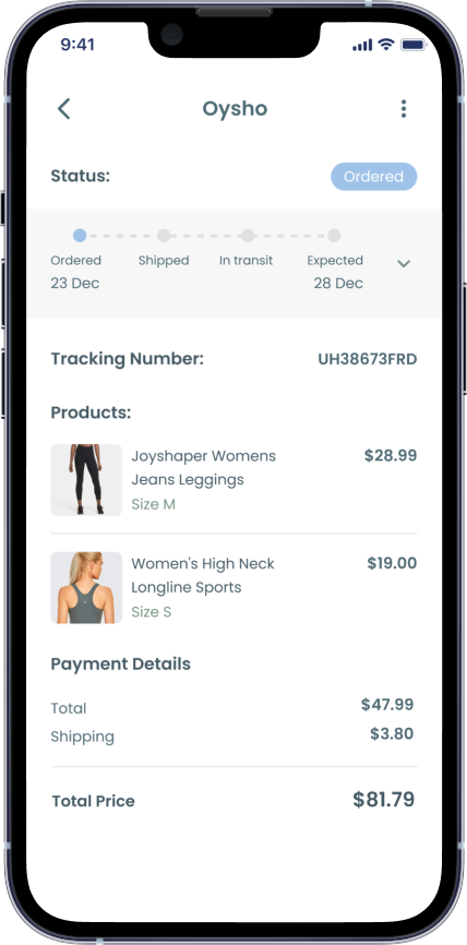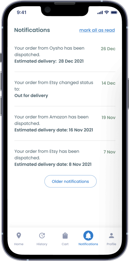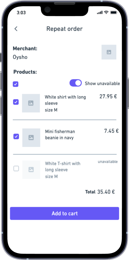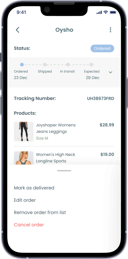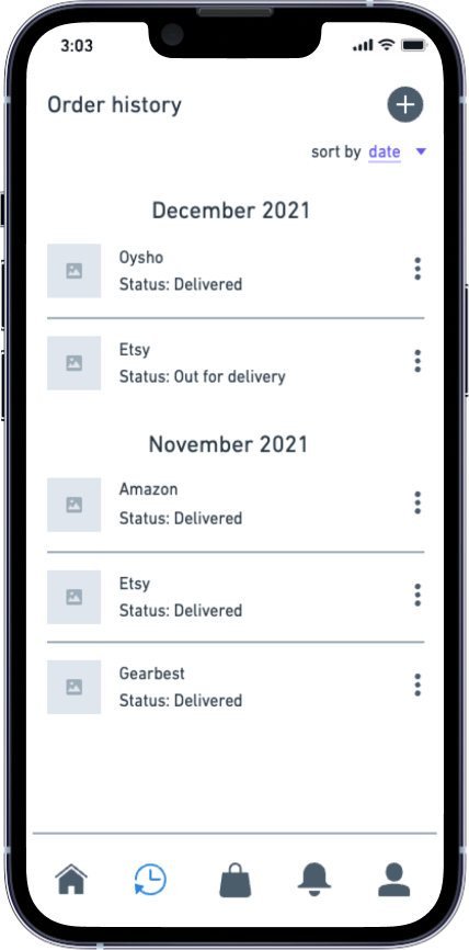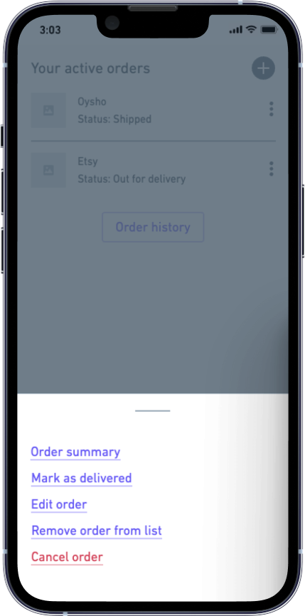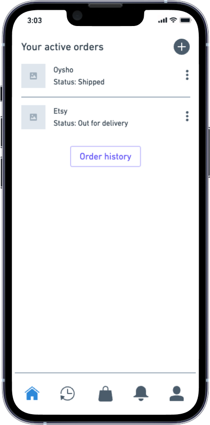 Sign in with your email, go to the history of you orders, select the order from Etsy in November 2021 and repeat it. Add everything to cart without checking out. Go to the home screen and track the last order from Oysho. Remove it from the list.